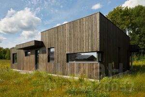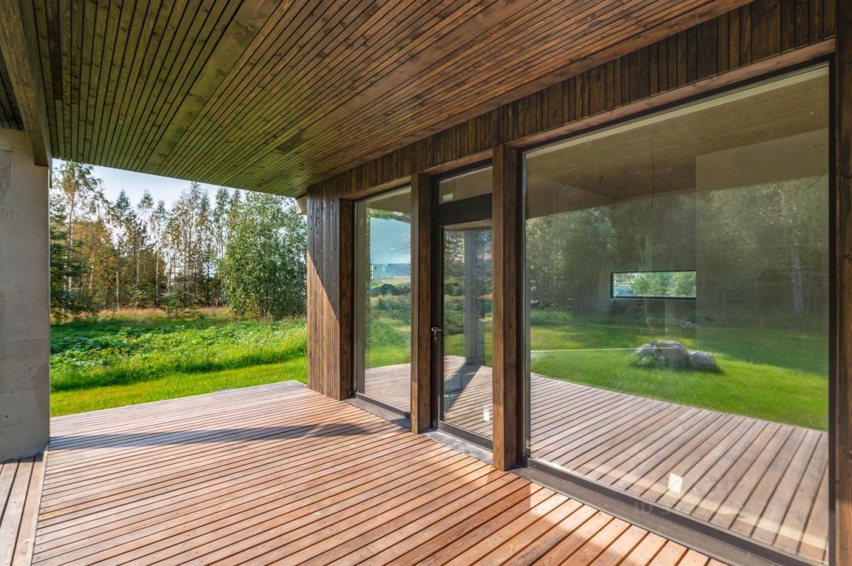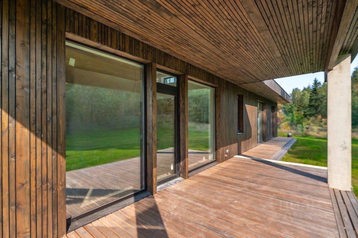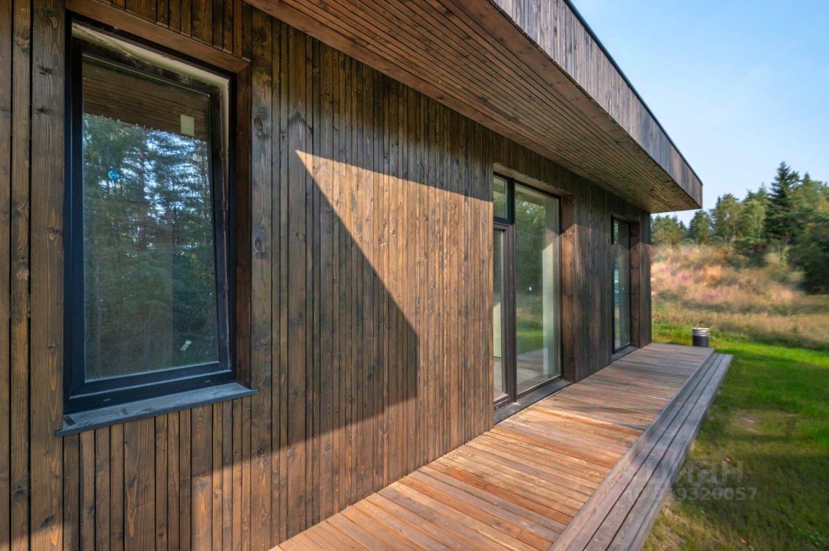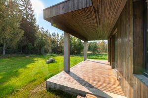 Дом построен на утеплённой шведской плите, стены из газобетона толщиной 400 мм, фасад отделан сосной, покрытой лазурью Акватекс Плюс. Крыша утеплена 300 мм минваты, покрыта ПВХ-мембраной Технониколь, с разуклонкой и скрытой водосточной системой.