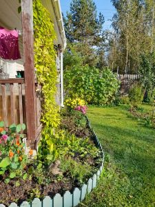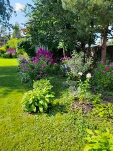 Участок разработан, ухожен, с красавицей елью, плодовыми деревьями и ягодными кустами (крыжовник, смородина), декорированный цветочными клумбами и маленьким прудом. Осуществляется бережный уход за газоном. Много цветов - гартензия, флоксы, розы, хризантемы.