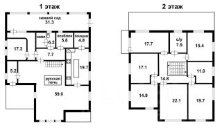 На 1 этаже находятся гостиная, зона кухни, гостевая комната, хамам, сан. узел с душевой кабиной, хозяйственный блок, бойлерная, русская печь, зимний сад.