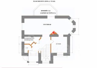 Первый этаж:1-й эт.: гостиная с камином, кухня, котельная, кладовая, закр.терраса,закрытая терраса, с/у.