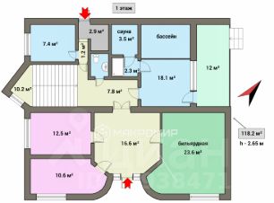 Первый этаж: Просторная зона для отдыха: бильярдная, бассейн, сауна, гостиная, гардеробная и выход на задний двор.