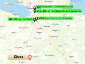 На автомобиле можно доехать за 50 минут, до КАД 60 км. Всего два светофора до города и везде ограничение 90. км/ч, транспортный поток умеренный, без пробок.