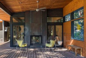 Дом отделан современными материалами. Фасад одной стороны дома и крыши отделаны черной металлической отделкой. Другая сторона домика отделана сосновой доской и отшлифованными фанерными панелями.
