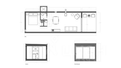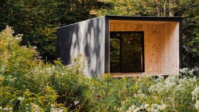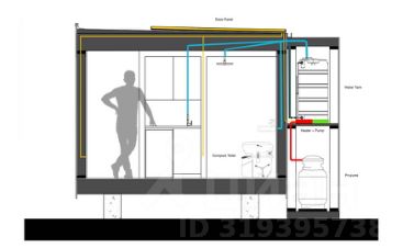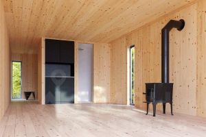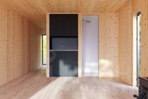Ванная комната и кладовая отделяет общественную зону от компактной спальни. Дом спроектирован для автономного проживания. Система сбора дождевой воды и дровяная печь — это те особенности, которые снижают зависимость от коммунальных услуг. В конструкции также есть солнечные панели, которые помогают вырабатывать энергию и нагревать воду. Данный проект был продуман для полного погружения в окружающую среду и проведения большей части времени на природе.