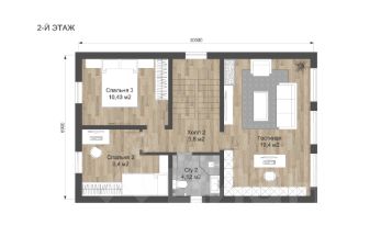 • 2 этаж: большая гостиная 19,4 кв.м. , 2 спальни 10.43 и 8.4 м², ванная комната
