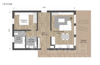 • 1 этаж: просторная кухня-гостиная 22 м² с выходом на террасу , мастер-спальня 10.65 м² с санузлом, тех. Помещение.