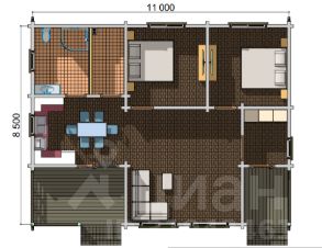 В доме расположены: две спальни по 11 .м. кв., гостиная - 23, 7 м.кв., кухня- 11,2 м.кв., санузел - 6,6 м.кв., тех. помещение - 4 м.кв. Просторная кухня-гостиная-столовая с большими окнами и выходом на террасу.