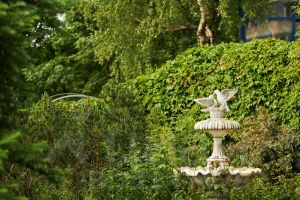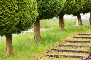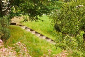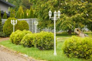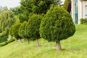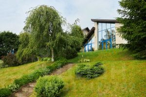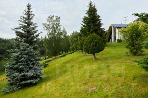 Выполнен эксклюзивный ландшафтный дизайн со множественными насаждениями различных цветов, кустарников и хвойных деревьев.
