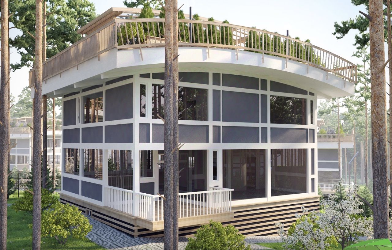 Первый этап строительства дома - "теплый контур" включает в себя возведение фундамента (забивные бетонные сваи), строительство самого дома, его отделка снаружи, панорамное остекление, черновые полы перекрытий, крыша, утепление дома по всему внешнему периметру.