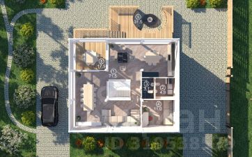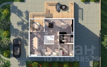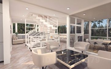 Большую часть 1 этажа занимает кухня-гостиная с панорамными окнами на три стороны света, с выходом на крытый балкон и открытую террасу. Здесь также находятся большая прихожая с гардеробом, хозяйственный блок: котельная/санузел/прачечная.