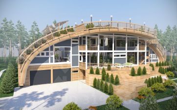 Двухэтажный дом с цоколем, эксплуатируемой кровлей (арочная конструкция), атриумом и вторым светом гостиной.
