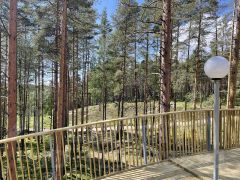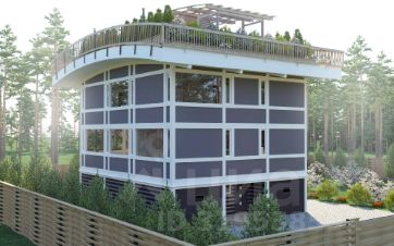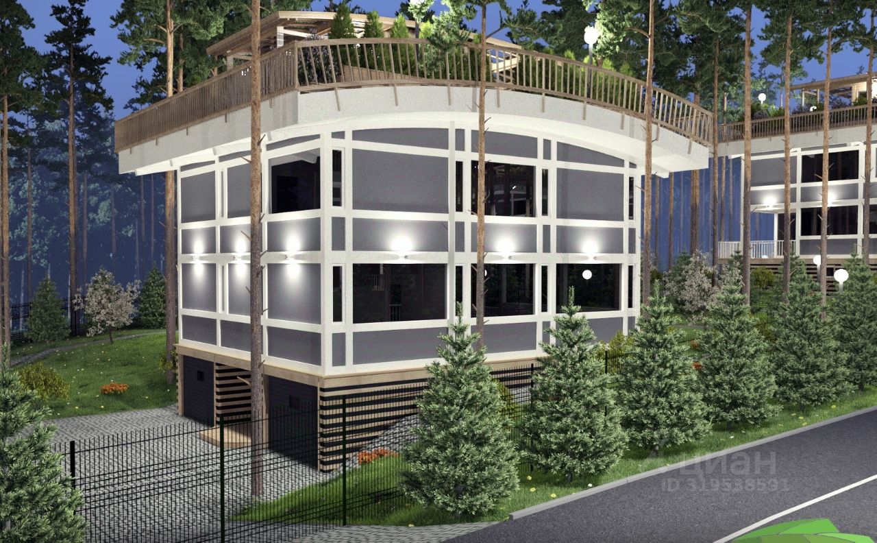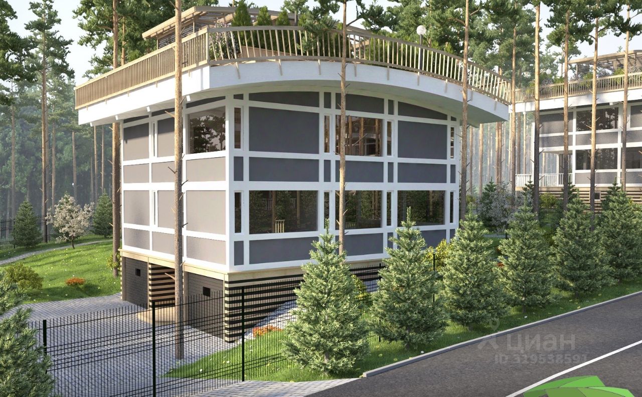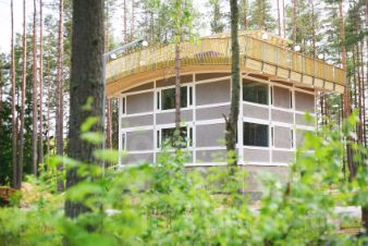 Участок расположен на возвышенности в окружении сосен, с крыши дома открывается прекрасный вид на кроны окружающих его деревьев.