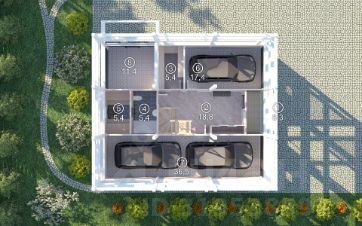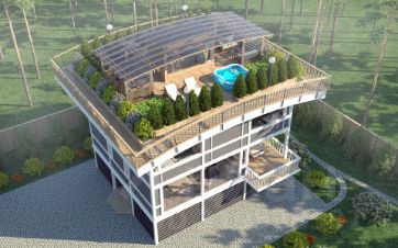Проект М имеет площадь внутренних отапливаемых помещений 287 м2, а вместе с большой открытой террасой и эксплуатируемой кровлей составляет 492 м2.