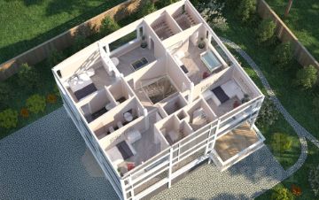 Третий этап строительства - сама чистовая отделка или отделка "под ключ". Она обычно выполняется индивидуально под конкретного заказчика с учетом его вкусов и предпочтений. Это включает чистовую отделку стен, их покраску, укладку керамической плитки в ванных и кварцвиниловой плитки в остальных помещениях, монтаж чистовых потолков, чистовой электрики и сантехники, установку межкомнатных дверей и кухонной мебели, чистовую отделку террасы, крыши, посадку растений.
