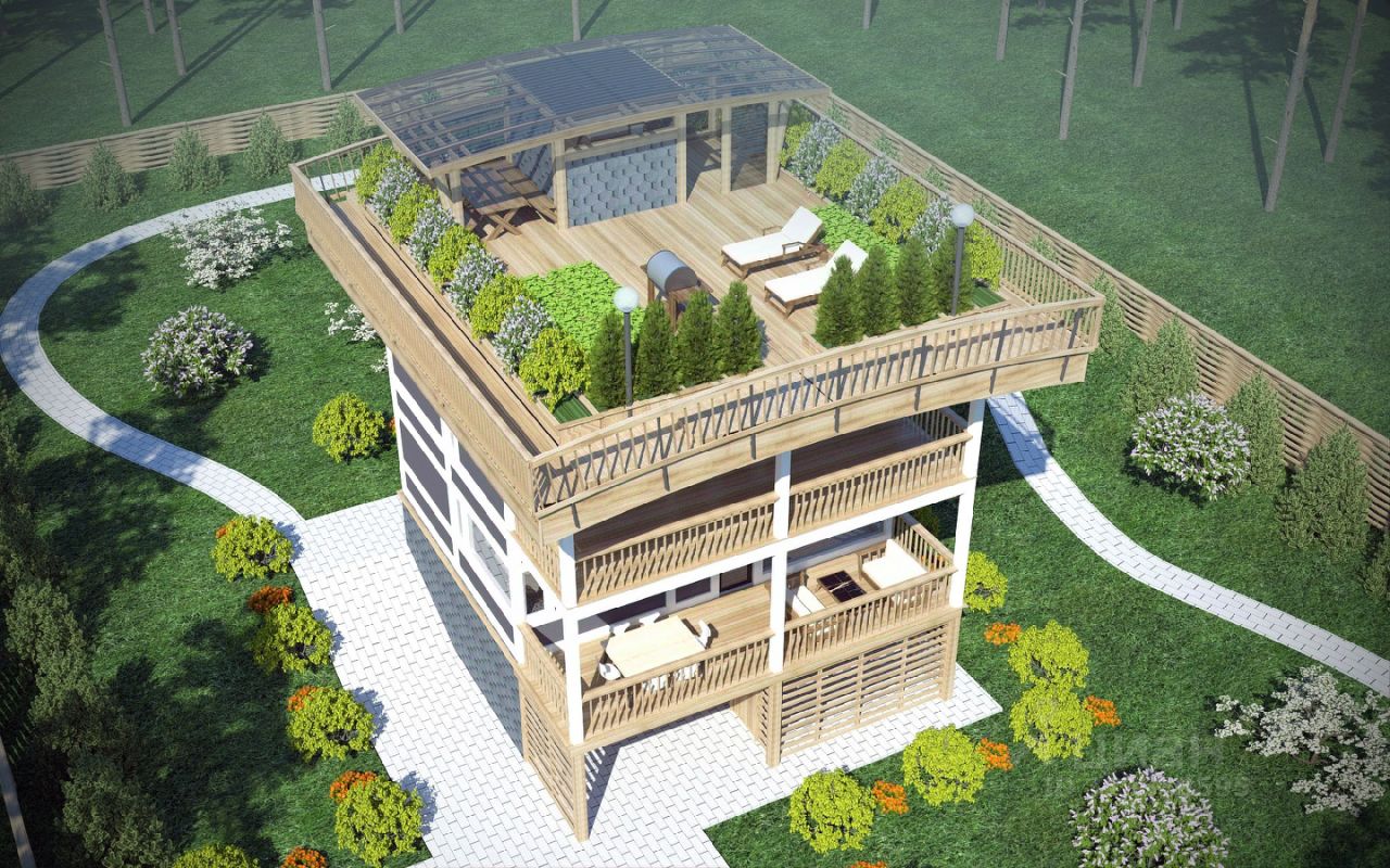 Прямо из холла второго этажа можно подняться по лестнице на эксплуатируемую кровлю. Здесь в окружении плодовых и декоративных растений на просторной открытой террасе могут располагаться кресла и шезлонги, детский бассейн, а под закрытым от дождя и ветра навесом летняя кухня с обеденным столом и местом для приготовления еды.