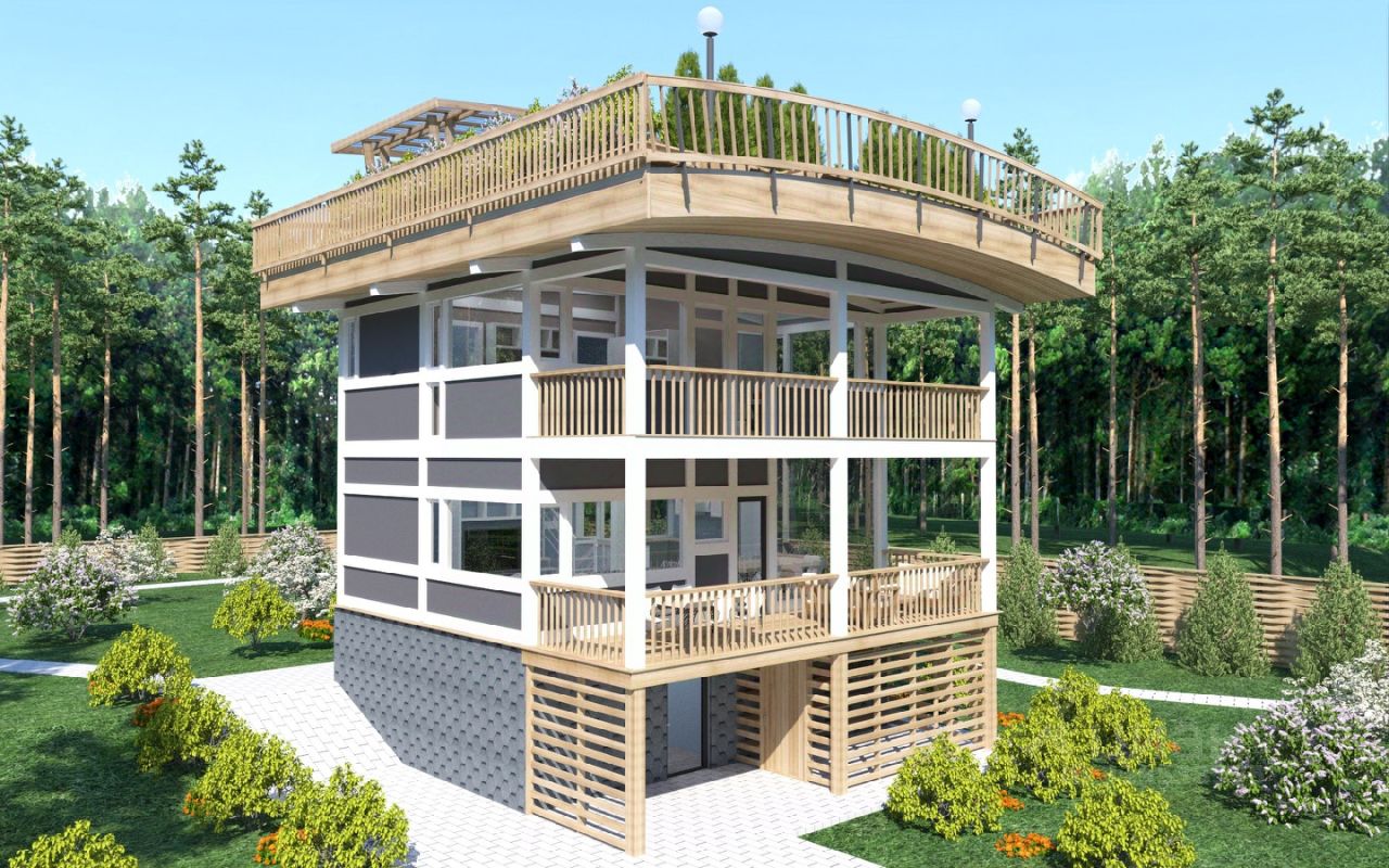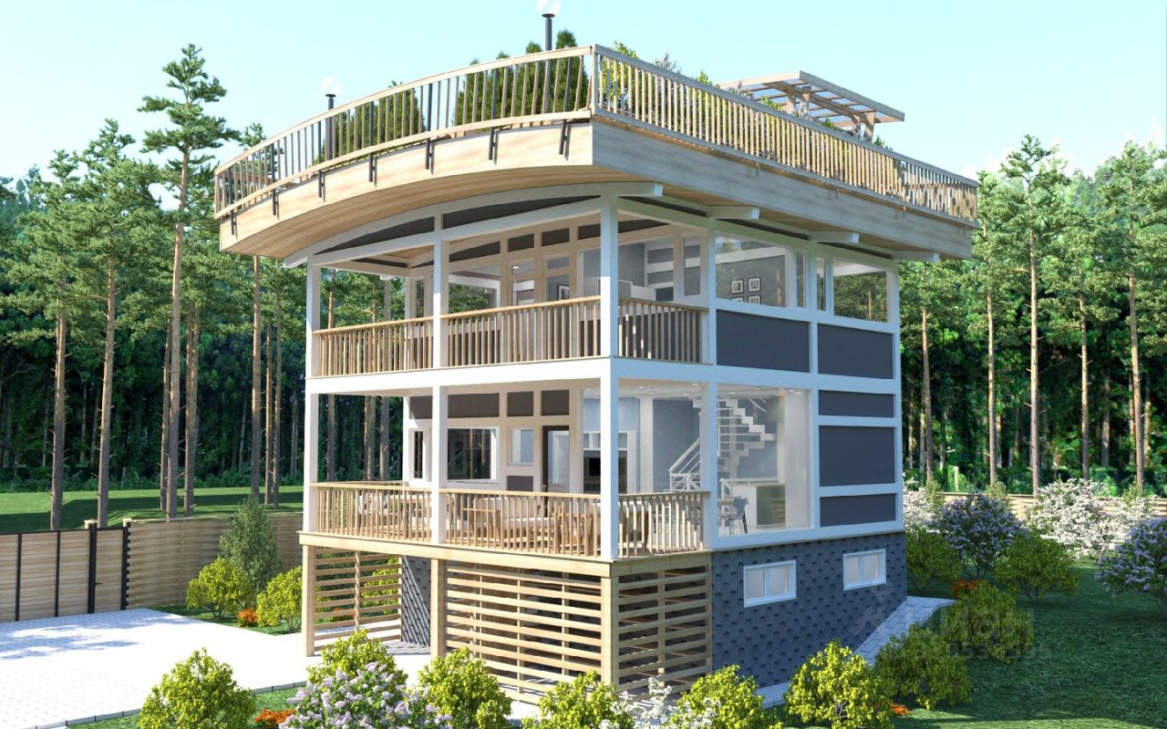 Первый этап строительства дома - "теплый контур" включает в себя возведение фундамента (забивные бетонные сваи), строительство самого дома, его отделка снаружи, панорамное остекление, черновые полы перекрытий, крыша, утепление дома по всему внешнему периметру.