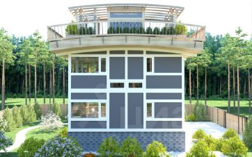 Для данного сравнительно небольшого участка спроектирован компактный дом из серии Hillpark - Проект XS (двухэтажный дом с цоколем, эксплуатируемой кровлей, балконом и террасой).
