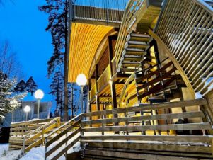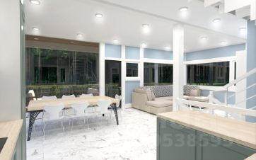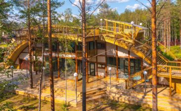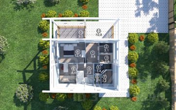 Практически весь 1 этаж дома занимает просторная кухня-гостиная с панорамными окнами на четыре стороны света и выходом на крытый балкон. Также на 1 этаже находится хозяйственное помещение котельной/санузла/постирочной.