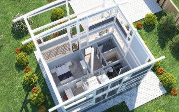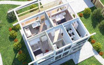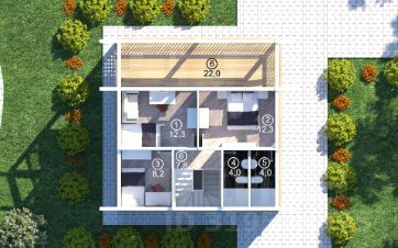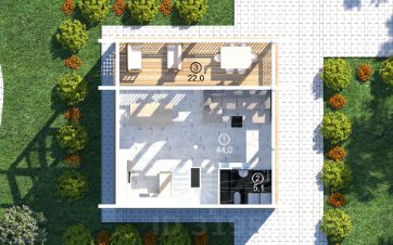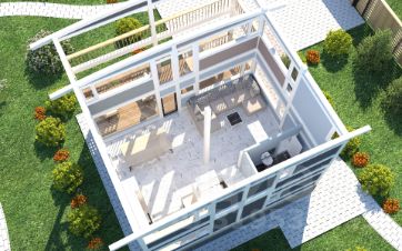 Проект XS имеет площадь внутренних отапливаемых помещений 152 м2, а вместе с большой открытой террасой и эксплуатируемой кровлей составляет 333 м2.