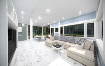 Третий этап строительства - сама чистовая отделка или отделка "под ключ". Она обычно выполняется индивидуально под конкретного заказчика с учетом его вкусов и предпочтений. Это включает чистовую отделку стен, их покраску, укладку керамической плитки в ванных и кварцвиниловой плитки в остальных помещениях, монтаж чистовых потолков, чистовой электрики и сантехники, установку межкомнатных дверей и кухонной мебели, чистовую отделку террасы, крыши, посадку растений.