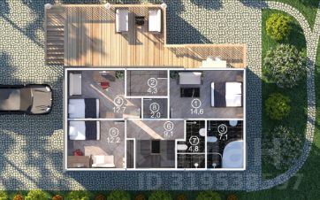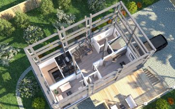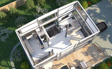 Проект S имеет площадь внутренних отапливаемых помещений 198 м2, а вместе с большой открытой террасой и эксплуатируемой кровлей составляет 367 м2.