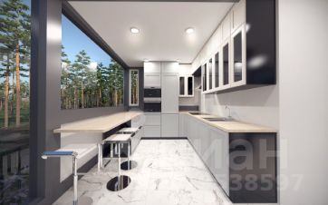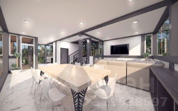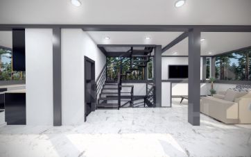 Практически весь 1 этаж занимает кухня-гостиная с панорамными окнами на четыре стороны света, с выходом на крытый балкон и открытую террасу.