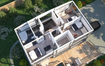 Третий этап строительства - сама чистовая отделка или отделка "под ключ". Она обычно выполняется индивидуально под конкретного заказчика с учетом его вкусов и предпочтений. Это включает чистовую отделку стен, их покраску, укладку керамической плитки в ванных и кварцвиниловой плитки в остальных помещениях, монтаж чистовых потолков, чистовой электрики и сантехники, установку межкомнатных дверей и кухонной мебели, чистовую отделку террасы, крыши, посадку растений.