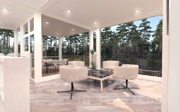 Третий этап строительства - сама чистовая отделка или отделка "под ключ". Она обычно выполняется индивидуально под конкретного заказчика с учетом его вкусов и предпочтений. Это включает чистовую отделку стен, их покраску, укладку керамической плитки в ванных и кварцвиниловой плитки в остальных помещениях, монтаж чистовых потолков, чистовой электрики и сантехники, установку межкомнатных дверей и кухонной мебели, чистовую отделку террасы, крыши, посадку растений.