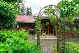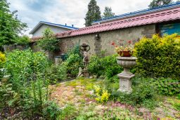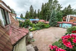 Территория благоустроена и украшена множеством растений и деревьев, создавая атмосферу уюта и гармонии с природой.