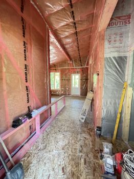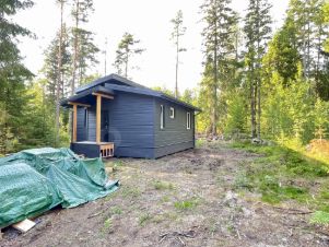 В 2025 году был возведен дом по каркасной технологии. Общая площадь дома 50 кв. метров + уютная терраса 16 кв. метров с видом на лес. Кровля фальц, фасад имитация бруса, остекление - двухкамерные энергосберегающие стеклопакеты Rehau. Полы рассчитаны под полусухую стяжку (если делать отопление по полу). Потолки от от 2,86 м. до 3,8 м. Проект рассчитан на круглогодичное проживание утепление по цоколю 200 мм, по фасаду 150 мм + перекрестное утепление 50 мм. Простыми словами, можно с городским комфортом пережить любой холод. На текущий момент готовность дома и участка к проживанию 80%. Будущему собственнику останется выполнить внутреннюю отделку дома по своему вкусу и завершить благоустройство расчищенной территории.