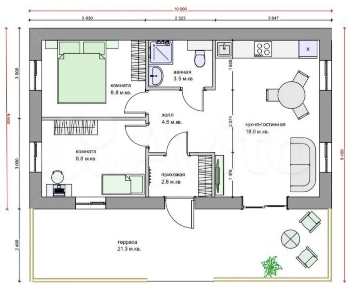 Кухня -гостинная 18 м.кв , просторный совмещенный с/у с душевой кабиной, две спальни по 9 м.кв.