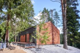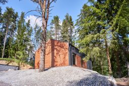 - Каркасный, толщина стен от 250 мм. Построен из сухой нестроганой антисептированной доски.