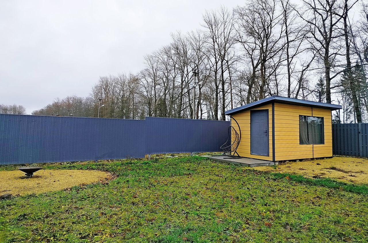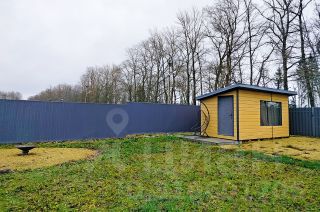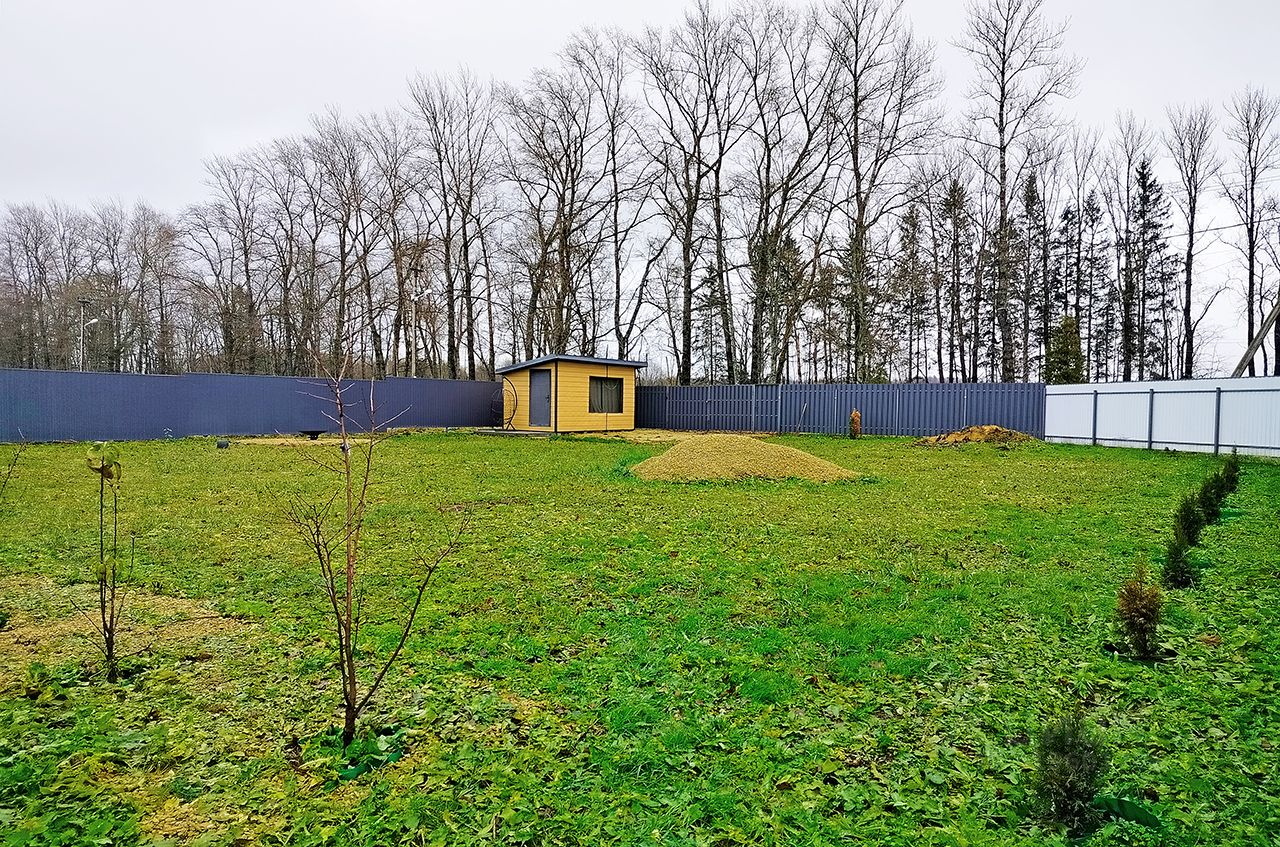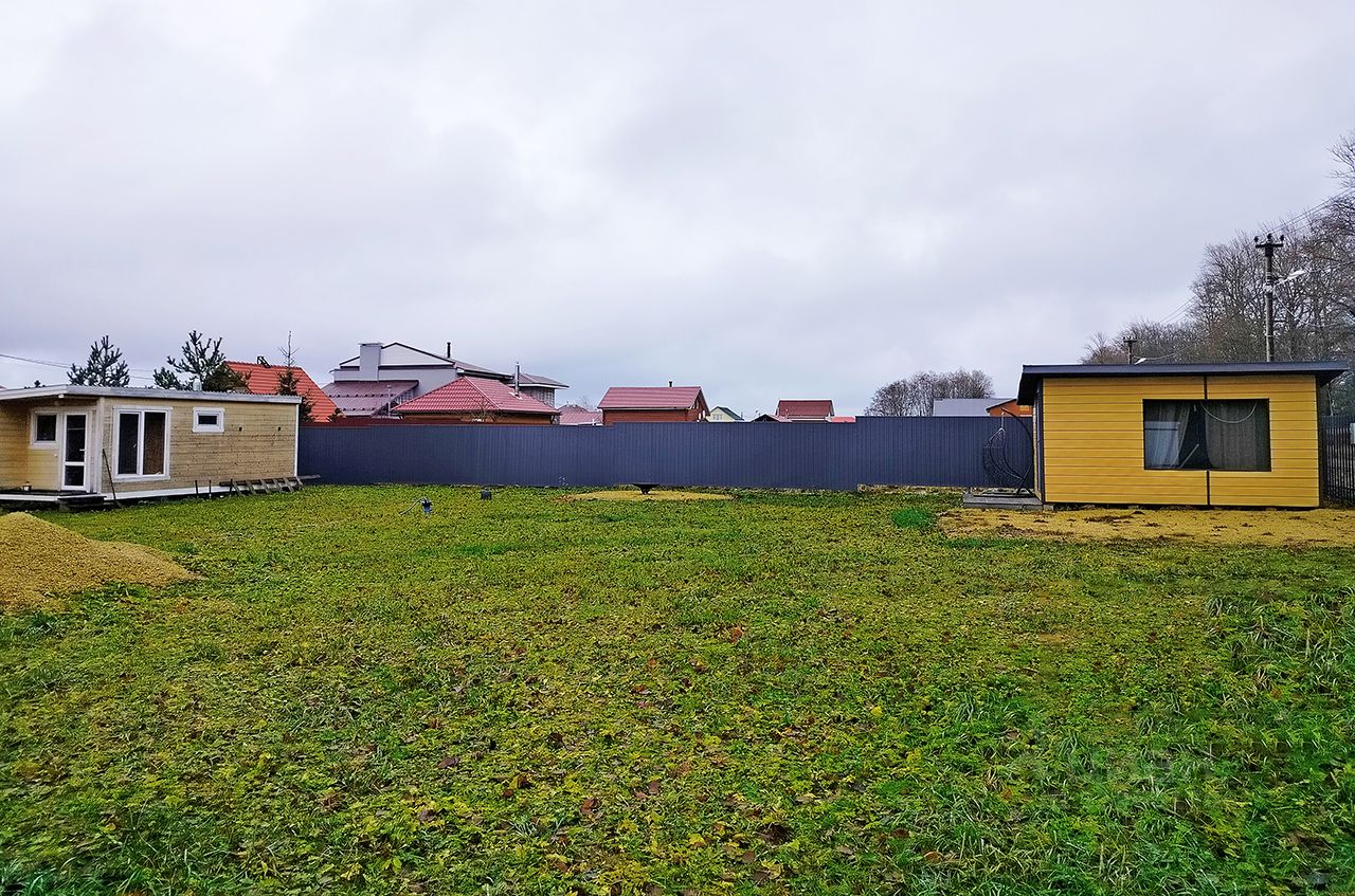 Участок сухой, ровный, правильной формы. Он полностью огорожен забором с воротами. Также обустроены парковочная зона и место для барбекю. На участке расположен небольшой каркасный временный дом площадью 20 кв.м и баня. Вдоль забора высажены туи и цветут розы. Прямо напротив участка находится здание охраны