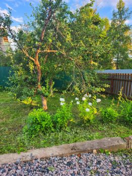 Богатый и зрелый сад: несколько сортов яблонь, вишня, слива, кусты смородины, крыжовник и прочие плодовые культуры.