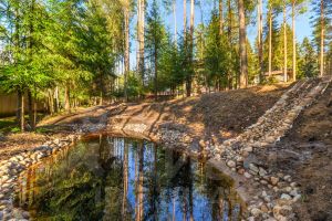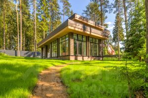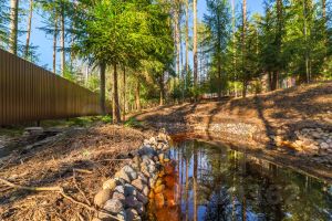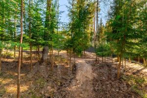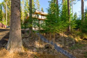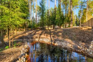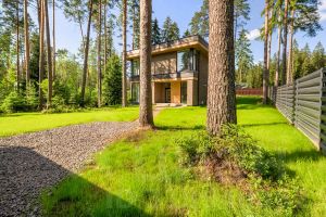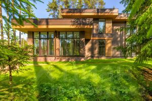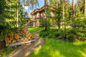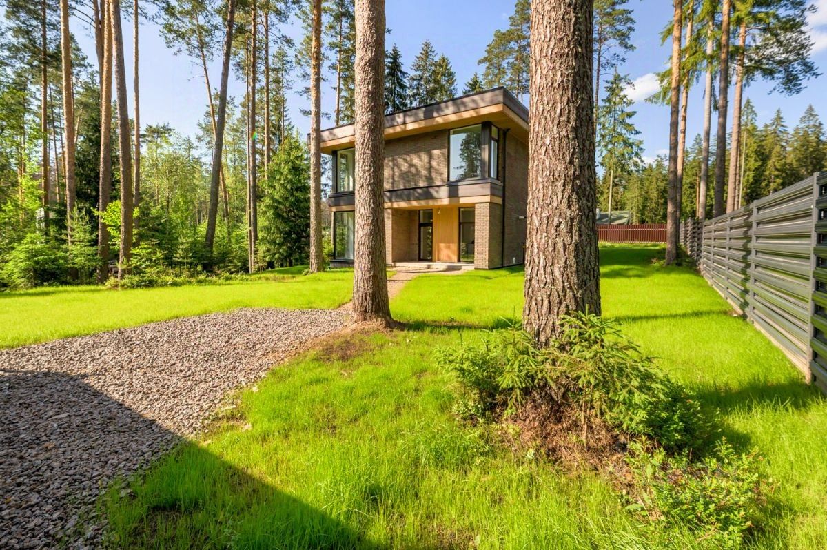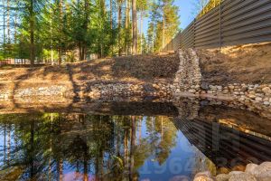 У дома уникальный двухуровневый участок с собственным лесом и ручьем протекающем по границе.