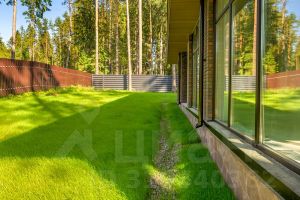 Участок выровнен, сделан дренаж, засеян газон, периметр закрыт забором и на въезде установлены ворота и калитка.