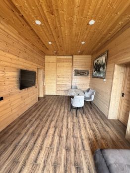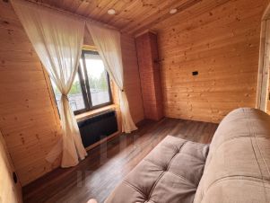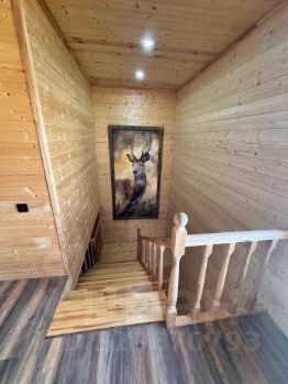 Дом обит изнутри натуральным брусом (сосна), что создает атмосферу уюта загородного деревенского дома. Поддерживает колорит настоящая русская печь с отапливаемой лежанкой вдоль панорамного окна. Топка печи выполнена из шамотного огнеупора, сама печь из высококачественного импортного кирпича Lode по индивидуальному проекту. Позволяет не только наслаждаться горящим огнем, но и готовить еду!