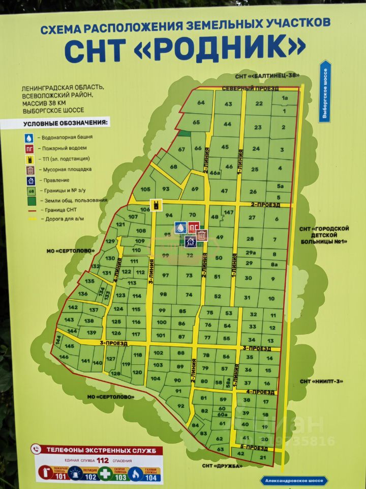 Территория СНТ "Родник" закрыта и окружена лесным массивом, создавая атмосферу уединения и спокойствия. Внутри территории грунтовые дороги, улицы освещаются в ночное время и находятся под круглосуточным видеонаблюдением. На территории есть свой водопровод и два продуктовых магазина. Рядом с СНТ расположены водоём с пляжем, спортивная площадка, спортивный конный клуб, частная школа и кафе.