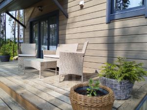 Территория участка огорожена, есть парковка на 2 машины. Вокруг - естественный природный ландшафт.