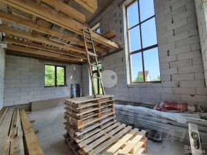 Кровля: холодный чердак. Утепление 250мм минвата, мауэрлат 150*150, обрешетка и контробрешетка 50*50, покрытие гибкая черепица. Не выполнены работы по подшивке кровли и установке софитов. Материалы на это закуплены, остался монтаж.
