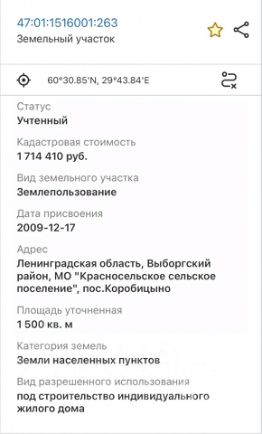Продается земельный участок в п.Коробицыно 15 соток ИЖС ( аренда 49 лет с правом выкупа 3% от кадастровой стоимости ). Аренда от 16.06.2010г. Участок угловой, правильной формы, сухой, ровный .Эл-во 15 квт, подключен центральный водопровод. Категория земли - населенных пунктов, разрешенное использование- под строительство индивидуального жилого дома. Кадастровый номер:47:01:1516001:263. До горнолыжных курортов 5 минут на машине `Красное озеро` Золотая Долина `Снежный. До центра поселка 10 минут пешком где есть сетевые магазины, кафе, школа, дет.сад , автобусная остановка и т.д. Отличное вложение денег для дальнейшего строительства домика под сдачу в аренду или для постоянного проживания. Участок можно разделить на два. Один взрослый собственник. Ждем Вас на просмотры. Участок расположен в пешей доступности 10 минут до центра поселка где есть сетевые магазины, аптека и автобусная остановка и т.д. До горнолыжных курортов 3 км.