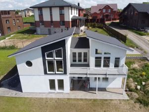 Фундамент - УШП ( утеплённая шведская плита )Фасад- Штукатурка Atlas (Польша)Краска Tikkurila (Финляндия )Тонкопиленная доска с поднятым ворсомУтепление кровли - Эковата 400ммСтропильные фермы заводского производства,Крыша - мягкая черепица icopal ( Финляндия ), Окна - rehau Двери - Jeld-wen ( Финляндия ). Напольные покрытия tarkett Тканевые натяжные потолки (Германия )..