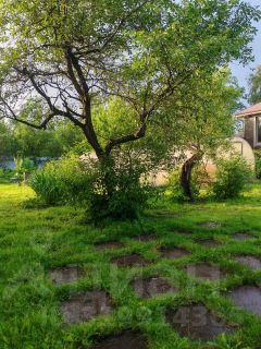 На участке плодоносящие деревья: яблони, вишня, кусты малины, смородины. Баня, гараж, участок огорожен забором.