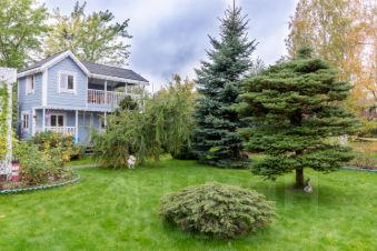 На участке высажено огромное количество редких растений, голубые ели, вымощены прогулочные дорожки, усадебный комплекс идеально вписывается в окружающий ландшафт и утопает в зелени. Так же расположен гараж на 4 а/м, банный комплекс, беседка с мангалом, игровой домик, пост охраны, и свой пруд.