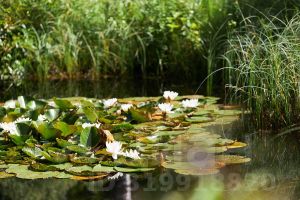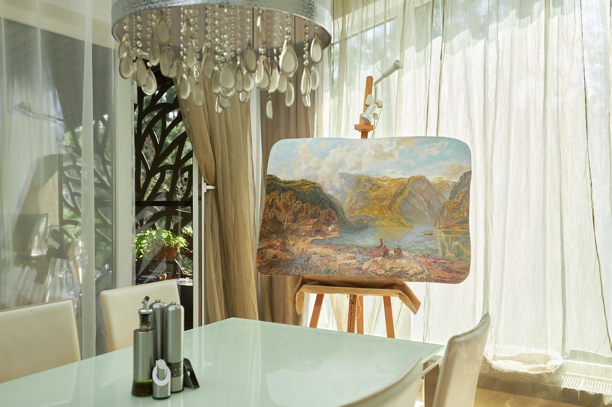 Высокие потолки и мансардные окна в очень просторной кухне-гостиной дарят ощущение пространства и света, а на уютном патио можно завтракать и обедать, любуясь красивым видом на сад и пруд.