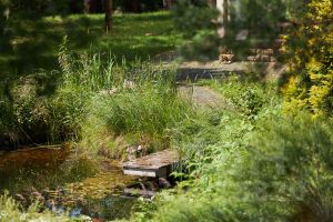 На участке сделаны дорожки и мощение, высажены ели разных видов, растут вековые сосны и есть собственный пруд, который при желании можно зарыбить.