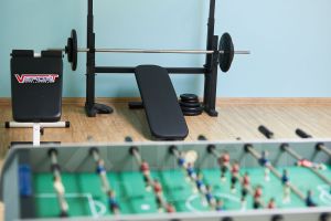 Также пройдя через бассейн можно попасть в просторный и светлый, благодаря потолочному куполу, спортивный зал.