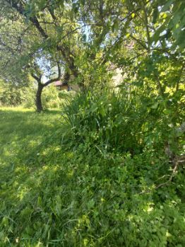 Участок ухожен. Плодовые деревья (яблони и сливы) и кусты (смородина )