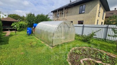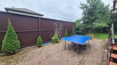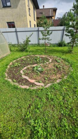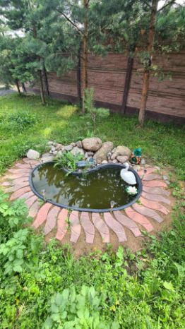 Также на участке расположена теплица, фруктовый сад, грядки и клумбы, небольшой прудик, газон и площадка с покрытием из искусственной травы для игр, по периметру участка высажены сосны, ели и туи.