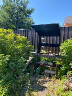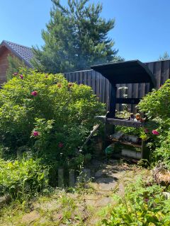 Участок огорожен, ухожен, сад, газон, зона барбекю, бытовка и цветочные клумбы.